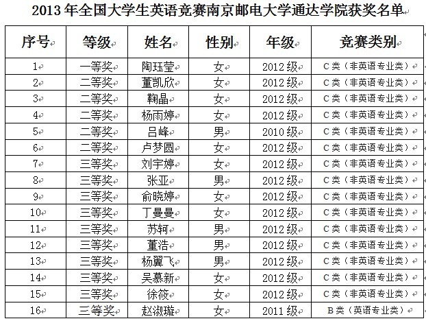 2013年全国大学生英语竞赛决赛成绩近日公布,完美官网共获得全国一等奖1名,二等奖5名,三等奖10名。同学们取得的优异成绩体现了完美官网学生较高的英语水平与优秀的文化语言素养。