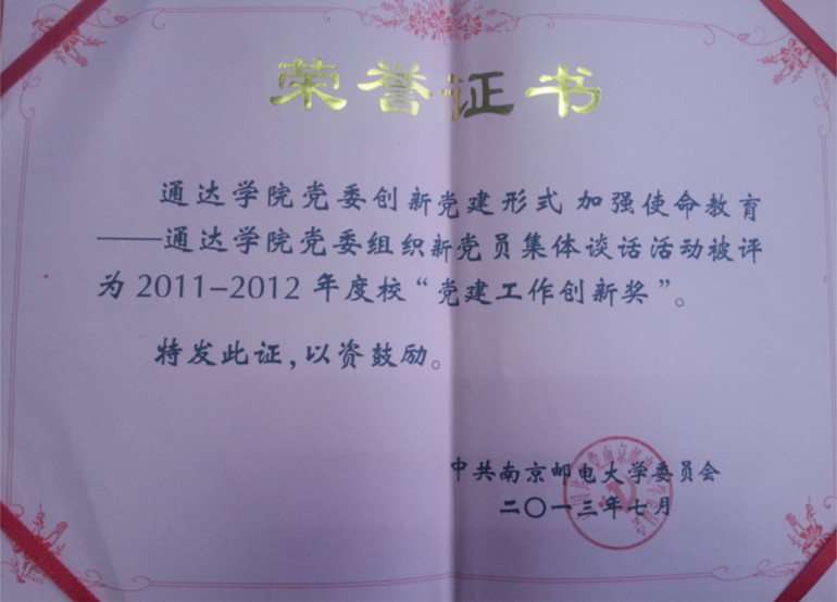 完美官网“创新党建形式 加强使命教育——组织新党员集体谈话”活动被365wm完美体育网页版党委评为2011—2012年度校“党建工作创新奖”;