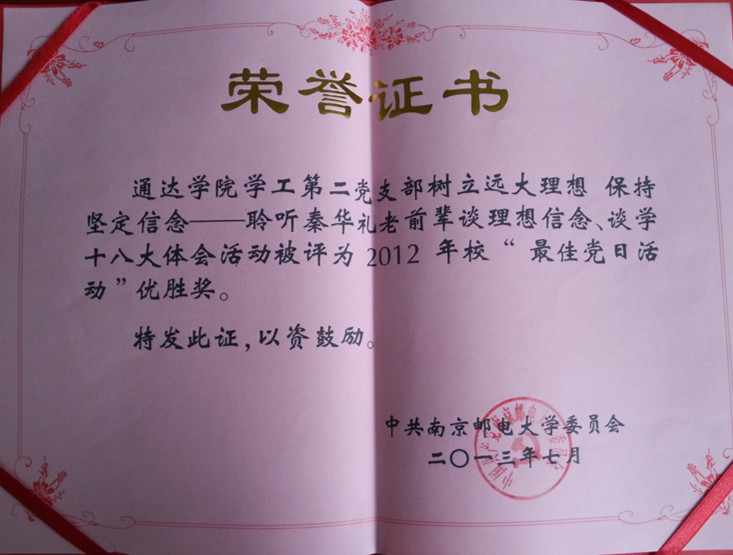 完美官网学工第二党支部“树立远大理想 保持坚定信念——聆听秦华礼老前辈谈理想信念、谈学十八大体会”活动被365wm完美体育网页版党委评为2012年校“最佳党日活动”优胜奖。