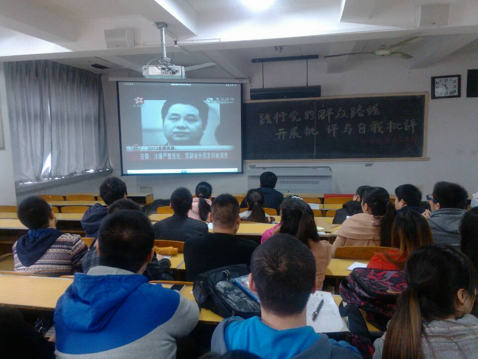 今年6月18日,习近平总书记对全党开展群众路线教育实践活动进行部署。他强调,此次教育实践活动的主要任务要聚焦到作风建设上,集中解决形式主义、官僚主义、享乐主义和奢靡之风这“四风”问题。要对作风之弊、行为之垢来一次大排查、大检修、大扫除。这项工作对于学生党员强化思想政治觉悟,认清党的本质,牢固树立正确的世界观、人生观和价值观,增强防腐意识,提高针砭时弊的能力起到了积极的教育意义。为此,第六支部专门组织学生党员观看了专题片《四风之害》。影片中,一些党员干部无视自身的“四风”问题倾向,最终走向人民群众对立面,锒铛入狱的例子令人叹惋、发人深省。参加活动的党员们也在讨论的过程中列举了一些大搞政绩工程的例子,“门难进、脸难看、事难办”,贪污腐化,奢靡享乐等不正之风。为此,党员们纷纷表示,要防范“四风”之害要从防治自身,劝谏他人做起,要不断加强政治理论与实践学习,坚定伟大的政治信仰,树立高尚的道德人格,防微杜渐,警钟长鸣,努力成为合格的社会主义事业的建设者和接班人。