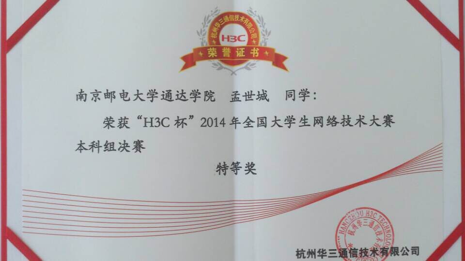 2014年7月13日下午,2014年“H3C杯”全国大学生网络技术大赛决赛在杭州H3C公司总部举行,完美官网2011级通信工程(嵌入式系统开发)专业孟世成同学以全国第二,江苏省第一的成绩晋级本次总决赛。经过激烈紧张的角逐,孟世城同学获得了全国唯一的特等奖,为学院争得了荣誉。