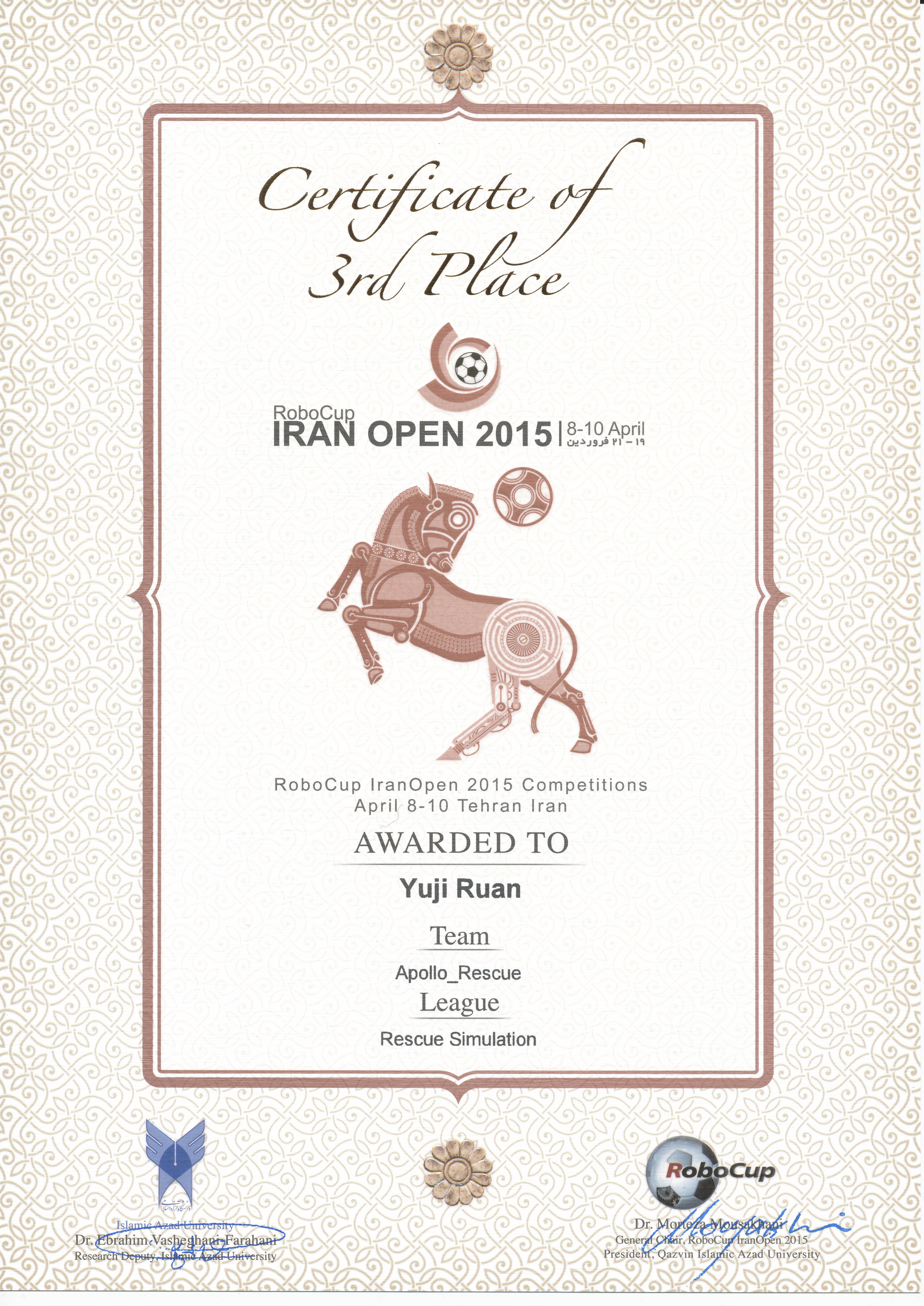 2015年4月8日-4月10日,Robocop伊朗国际公开赛场在伊朗首都德黑兰举行,由完美官网2011级学生阮宇吉作为领队,率领的Apollo_Rsecue队伍,在救援仿真组比赛中发挥出色,在决赛中曾一路领先,大有夺冠之势,但由于最后一张地图出现的一些失误而与冠军失之交臂。最终,经过队员不懈努力拼搏,完美官网代表队获得季军,这也是完美官网该项目首次在国际赛事上获奖,达到了世界一流队伍的水平。
