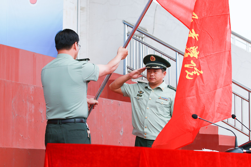 最后,学院党委副书记王立辉向军训团授旗,并在随后的讲话中要求2015级新生在军训中严守纪律,敢于吃苦,虚心学习,牢记安全,以优异成绩向纪念抗日战争暨世界反法西斯战争胜利70周年献礼。