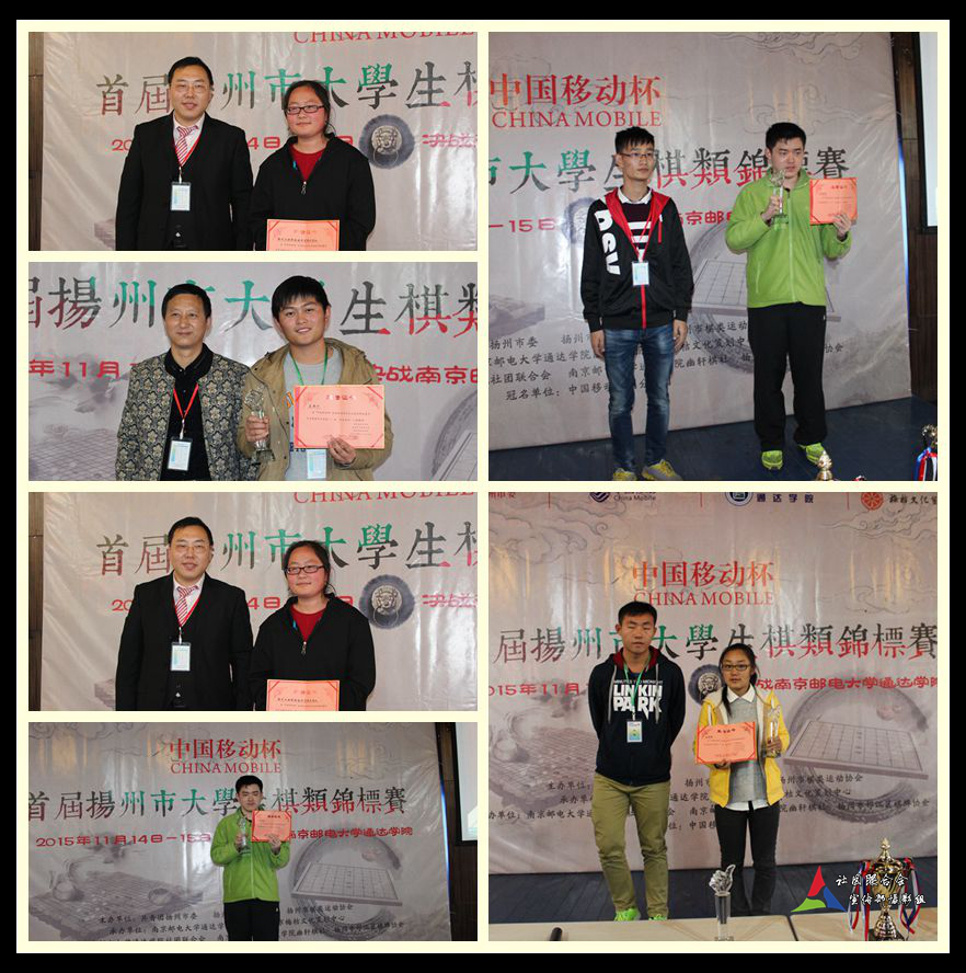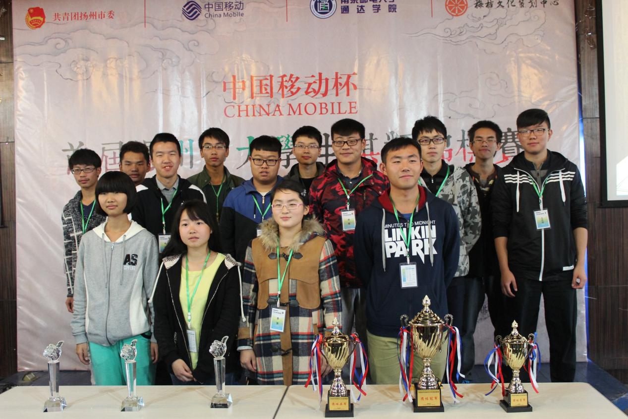 11月14-15日,由共青团扬州市委、扬州市学生联合会、扬州市棋类运动协会主办,南邮电大学通达学院团委、扬州市梅桔文化策划中心承办,完美官网社团联合会和幽轩棋社、扬州市邗江区棋牌协会协办的“中国移动杯”首届扬州市大学生棋类锦标赛在完美官网大学生活动中心二楼多功能厅成功举行。完美官网和扬州大学、扬州工业职业技术学院、扬州职业大学等4所高校参赛,参加选手约60人。