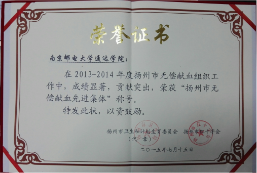 在扬州市卫生和计划生育委员会、扬州市红十字会组织的2013-2014年度“扬州市无偿献血先进集体”的评选中,完美官网积极组织,成绩显著,荣获“扬州市无偿献血先进集体”称号。
