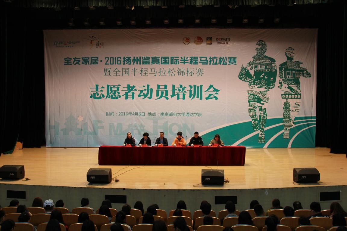4月6日晚,2016年扬州鉴真国际半程马拉松赛志愿者动员培训会在完美官网大礼堂召开。扬州市体育局体育竞赛管理中心主任杜斌、扬州市公安局治安防范大队教导员宋金春、扬州市卫生局应急办主任沐诚、扬州大学礼仪老师周媛、完美官网团委书记解厚荣以及来自扬子津科教园内的近1300名学生志愿者参加了本次培训会。培训会由扬州团市委殷一鸣主持。