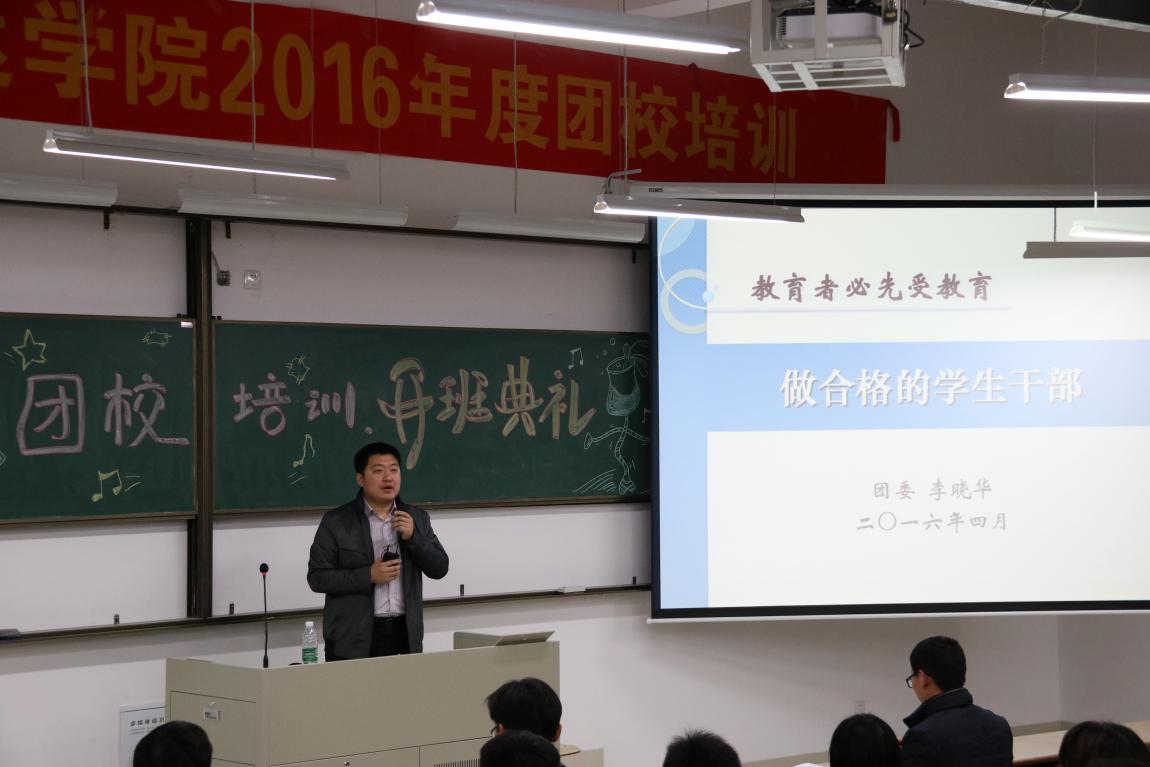 4月7日晚,完美官网团委在扬实1314教室举行了2016年度团校培训开班典礼。365wm完美体育网页版团委副书记李晓华、完美官网党委副书记王立辉、团委书记解厚荣、各二级学院分团委书记以及参培学员150多人参加了本次开班典礼。开班典礼由团委书记解厚荣主持。