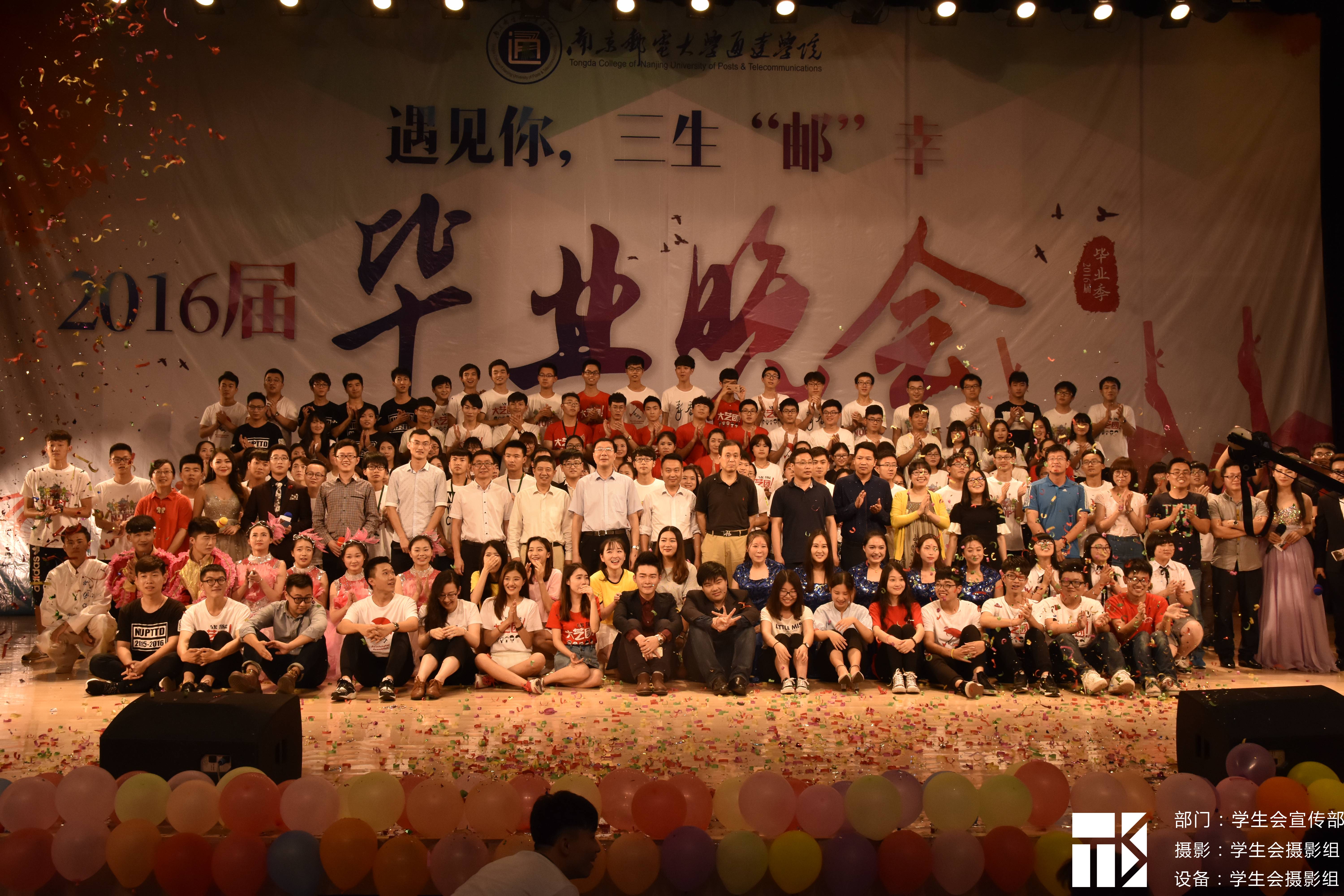 6月12日晚,由院团委主办的“遇见你,三生‘邮’幸”2016届毕业晚会在大学生活动中心礼堂举行。院长宗平、党委书记戴兆骏、常务副院长周西峰、党委副书记王立辉、扬州移动邗江分公司总经理沈振新、扬州铭扬培训服务有限公司总经理朱涛以及完美官网各部门领导、辅导员、2016届毕业生共1200余人观看了本次晚会。