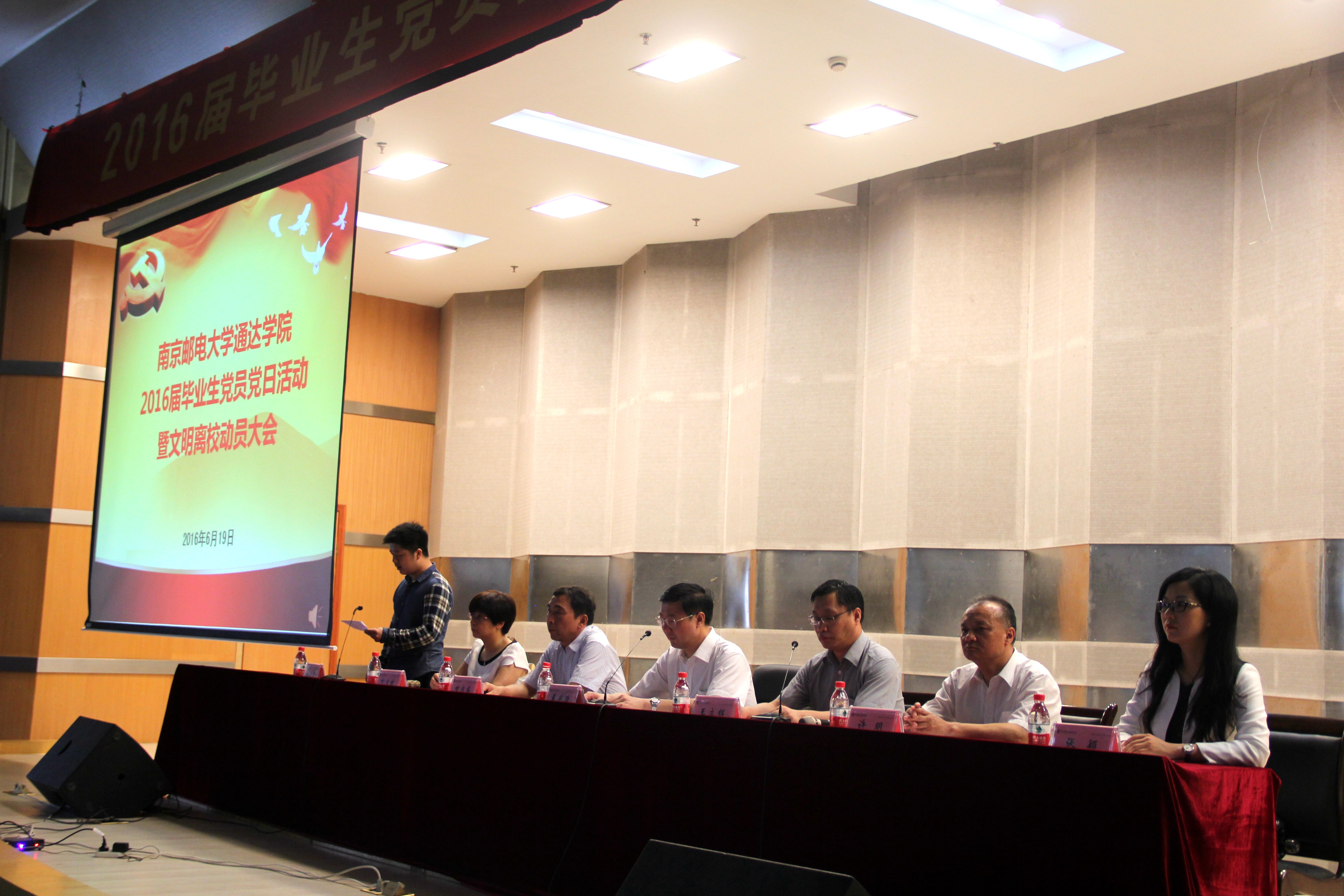 6月19日下午,学院党委在行政楼报告厅举行了2016届毕业生党员党日活动暨文明离校动员大会。152名2016届毕业生党员济济一堂,院党委委员、各毕业生党支部书记和学工处、团委等部门负责人出席大会。会议由院党委副书记王立辉同志主持。