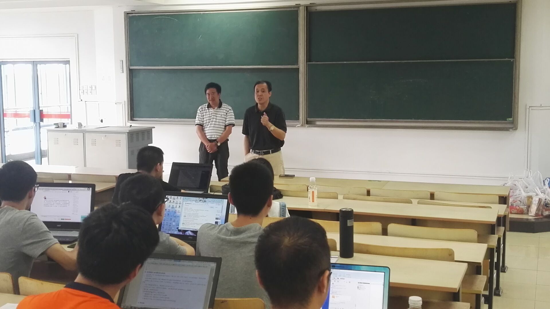 8月23日上午,365wm完美体育网页版宗平院长、包刚副院长、基础部张颖主任以及365wm完美体育网页版理学院李永涛副院长、工程数学教学中心孔告化主任一行冒着高温亲临数学建模培训现场,听取了数学建模带队指导老师范胜雪的培训情况汇报,并慰问了参加培训的指导老师和学生。