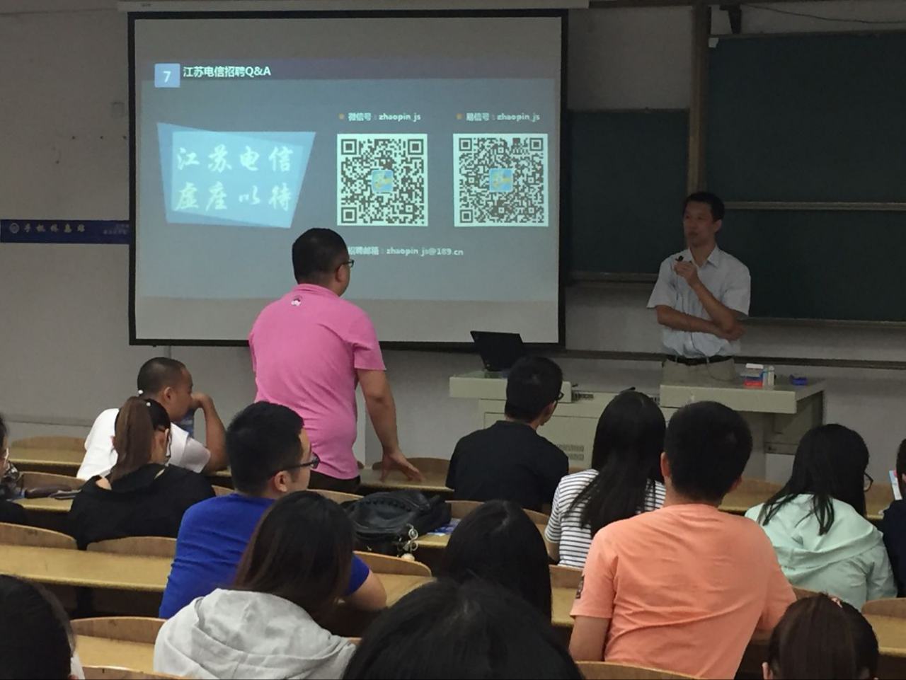 车老师首先介绍了中国电信江苏分公司的基本情况,对本次校招的招聘岗位、专业、人数及基本要求均做了详细阐述,对学生入职后的职业发展和待遇进行了说明。会上,车老师还特别对完美官网学生表达了江苏电信公司对南邮通达学院的重视,鼓励完美官网毕业生积极报名应聘。会上,同学们纷纷举手提问互动,既表达了对应聘中国电信江苏公司工作的向往,也表示回去后要精心准备、积极备考。