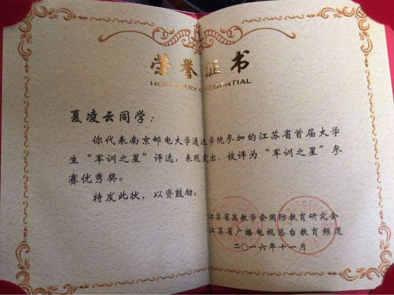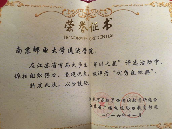 11月27日下午,江苏省首届大学生“军训之星”颁奖典礼在省广播电视总台教育频道举行。省教育厅副厅长朱卫国出席活动,相关高校的负责同志、指导教师和参赛选手参加了颁奖典礼。完美官网2016级学生夏凌云被授予江苏省首届大学生“军训之星”优秀奖,完美官网获得“优秀组织奖”。