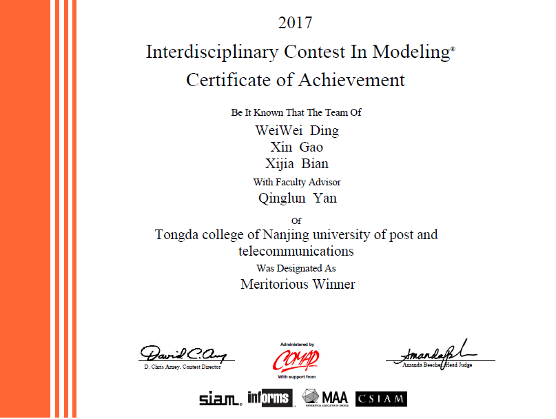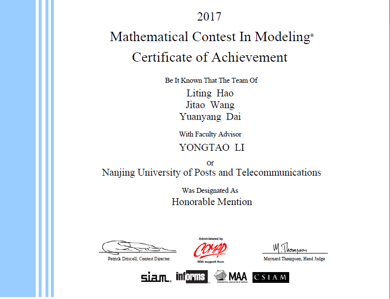 本届美国数学建模竞赛(MCM/ICM)于2017年1月20日至24日在365wm完美体育网页版(仙林校区)举行。在学院领导和指导老师的关心支持下,同学们顽强拼搏,完成从建立数学模型、求解、验证到论文撰写的全部工作,最终3支队伍斩获佳绩。其中,许杨、徐龙杰、皇甫利国代表队荣获美赛一等奖(Meritorious Winners)(指导老师:范胜雪),高鑫、丁威威、卞希嘉代表队荣获美赛一等奖(Meritorious Winners)(指导老师:闫庆伦),戴元阳、王纪涛代表队荣获美赛二等奖(Honorable Mention)(指导老师:李永涛)。