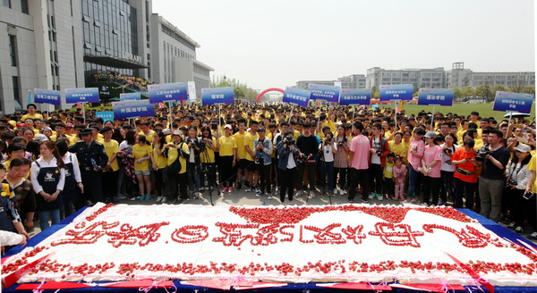 随着老书记秦华礼打响校园跑的发令枪,校园跑选手呐喊着、奔跑着,欢声笑语响彻春天的校园。全体校领导也参加了校园跑,并在随后的颁奖典礼上为精英跑全体参赛者、校园跑参赛代表、线上跑获得全部40枚电子奖牌代表颁奖。现场还制作了由校友捐赠的宽1.9米长4.2米厚75毫米的巨型生日蛋糕,寓意南邮从1942年诞生至今,已经走过75周年的光荣历程。蛋糕上鲜红的草莓摆出了“祝母校75岁生日快乐”的字样。
