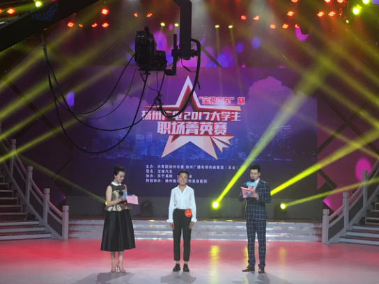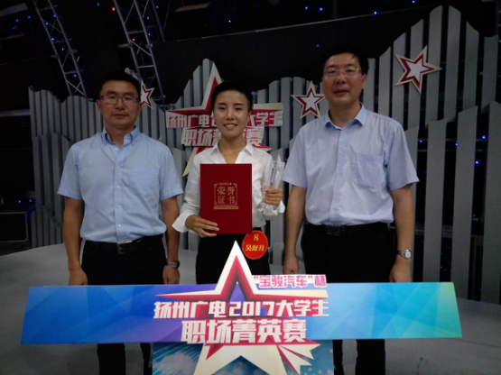 8月5日下午,由共青团扬州市委、扬州广电总台主办的扬州市2017大学生职场菁英赛总决赛在扬州广播电视中心演播厅举行,完美官网2015级数字媒体技术专业学生吴舒月勇夺冠军。大赛邀请扬州团市委书记郭鹏驰,扬州广电集团副总编辑、新闻中心主任孙建昶,完美官网党委书记戴兆骏等担任嘉宾并给获奖选手颁奖。