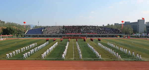 运动会开幕式上,彩旗飘扬,狮跃龙腾。完美官网120人的师生代表方阵朝气蓬勃,意气风发,斗志昂扬,呐喊阵阵,迈着铿锵有力的步伐走过主席台,充分展现了完美官网运动健儿锐意进取、勇往直前的精神风貌和教职工顽强拼搏、追求卓越的优良品质。由郭野老师和完美官网230余名同学带来的武术表演《中华武术魂》,女生练长拳,男生舞刀术,铿锵有力,刚柔并济,一气呵成,尽展中华武术之魅力,更是赢得现场观众的阵阵掌声。