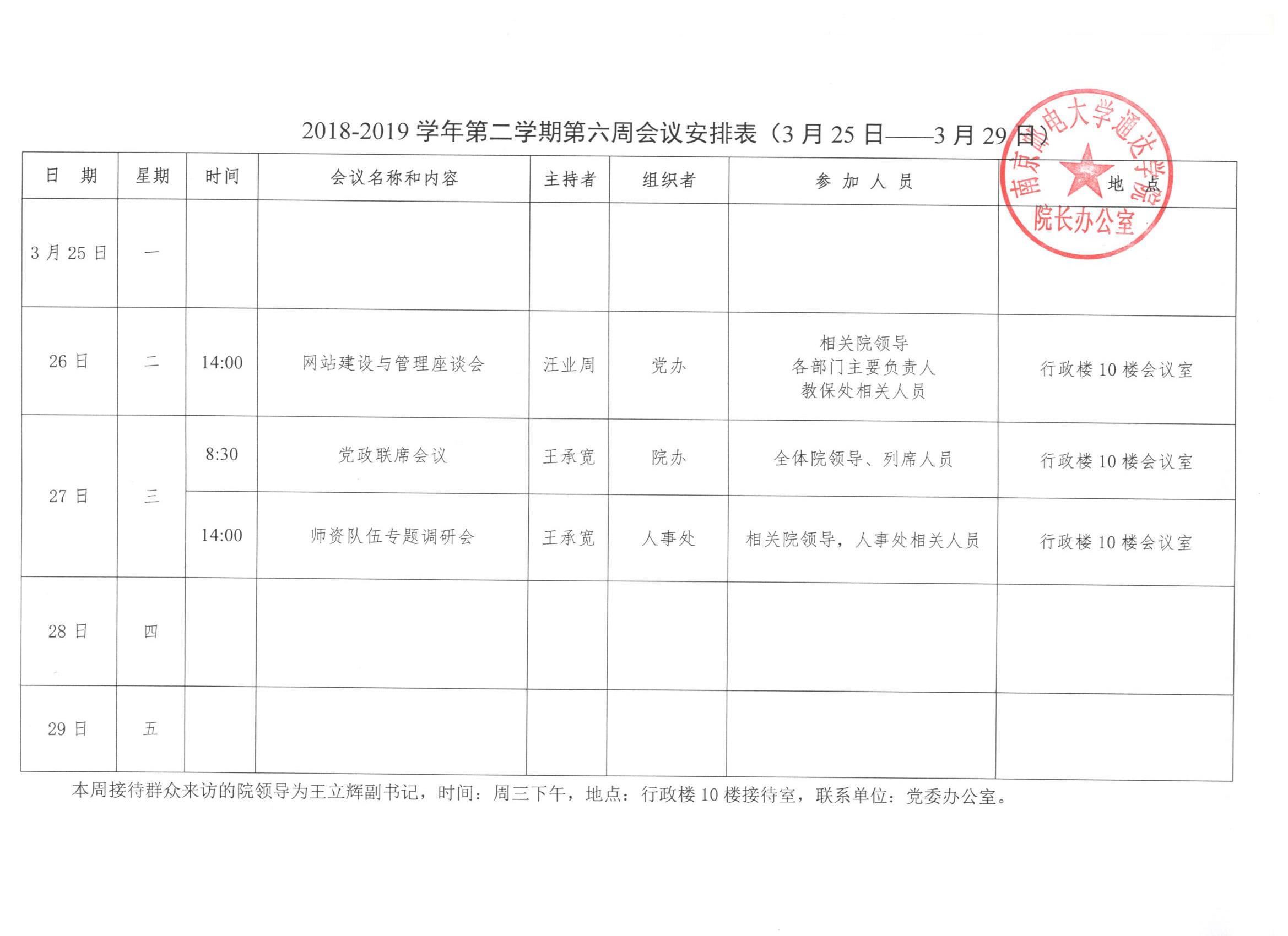2018-2019学年第二学期第六周会议安排表