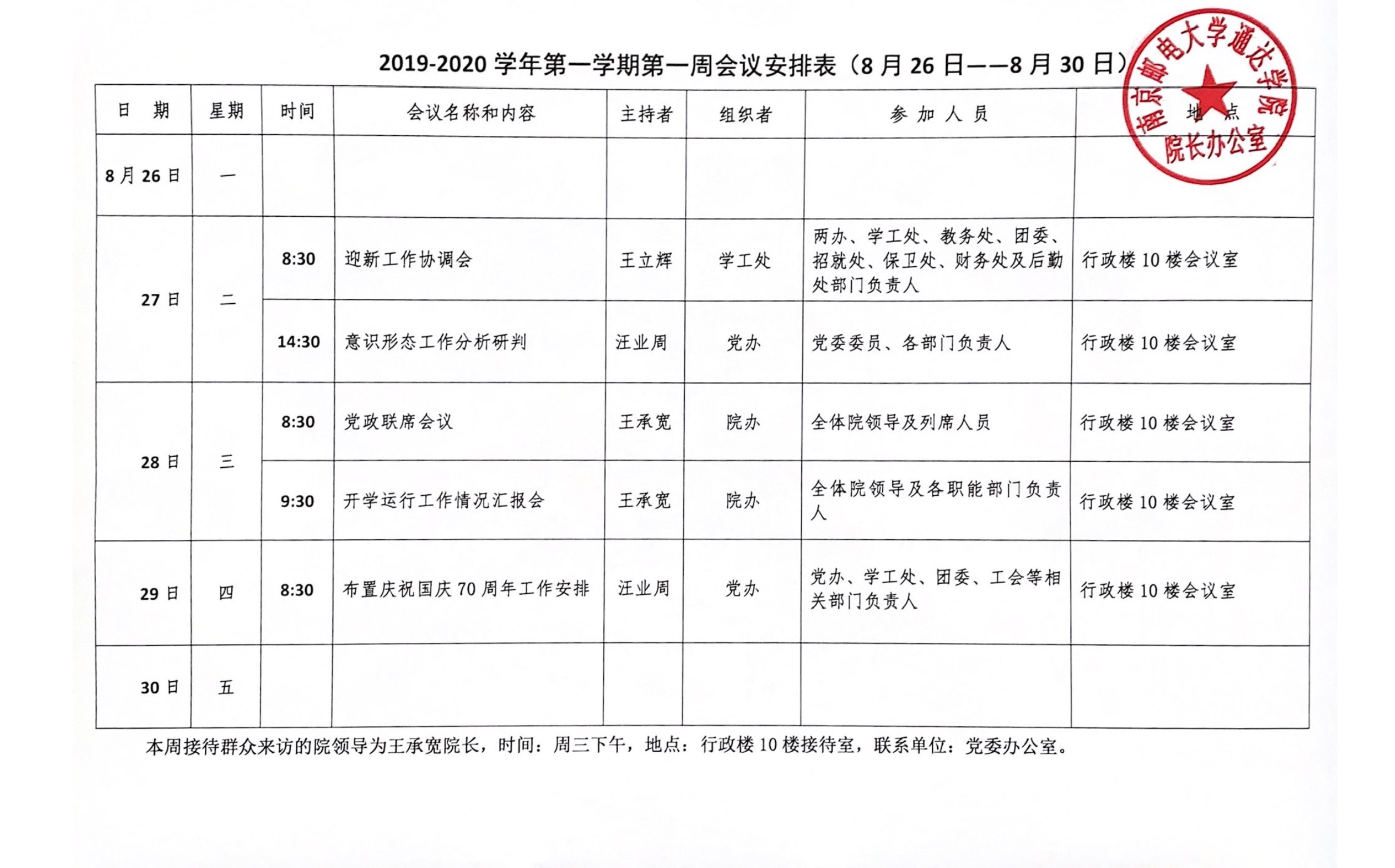 2019-2020学年第一学期第一周会议安排表