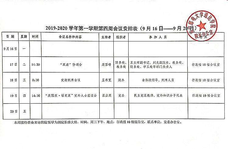 2019-2020学年第一学期第四周会议安排表