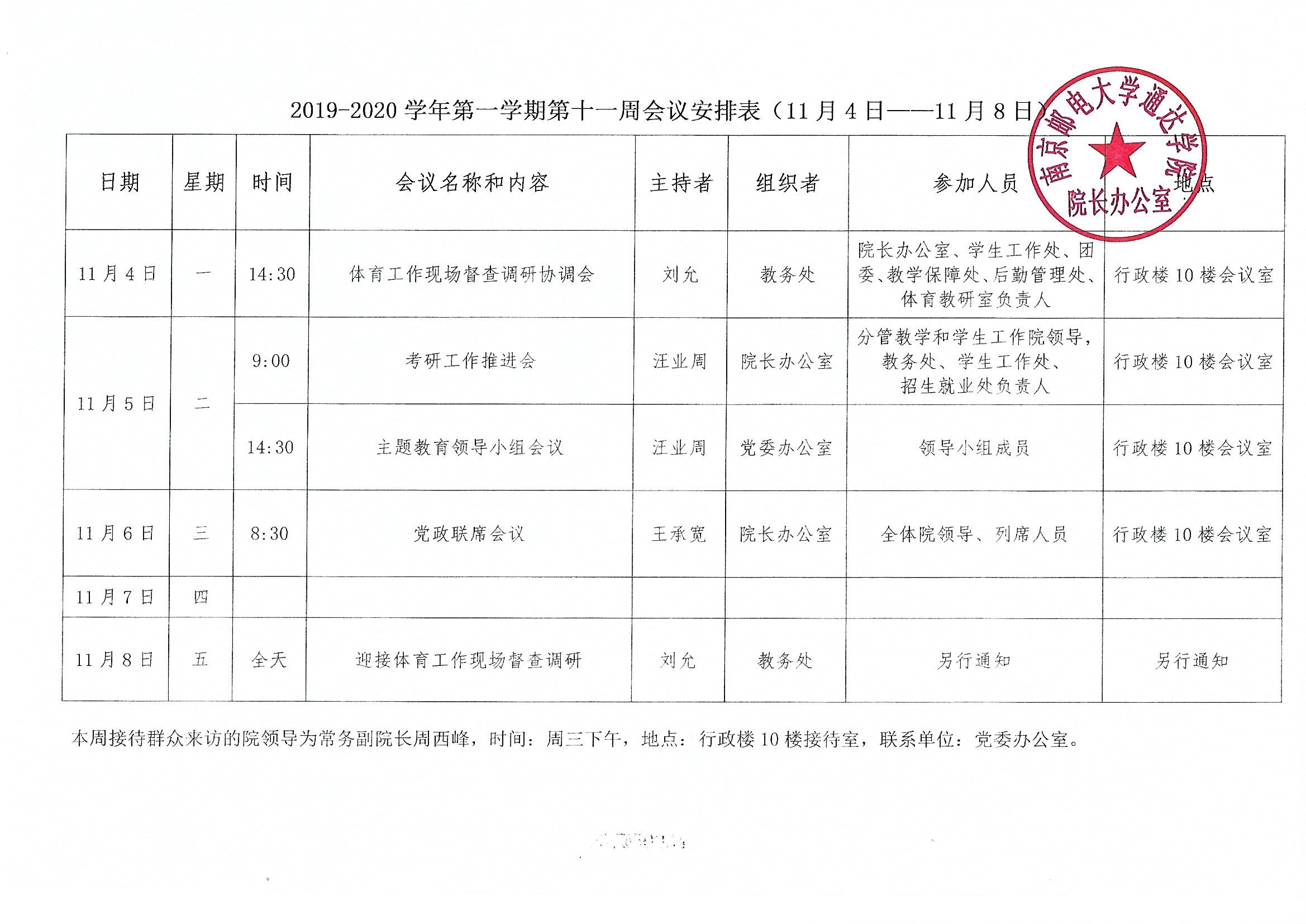 2019-2020学年第一学期第十一周会议安排表