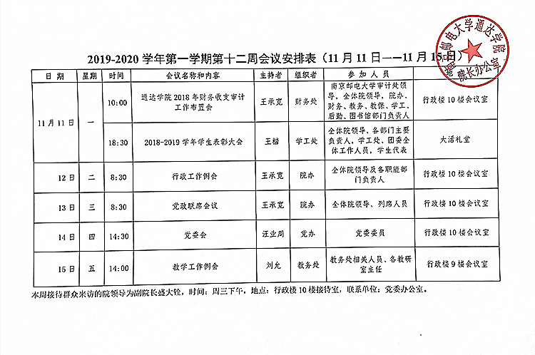 2019-2020学年第一学期第十二周会议安排表