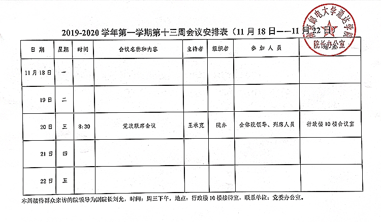 2019-2020学年第一学期第十三周会议安排表