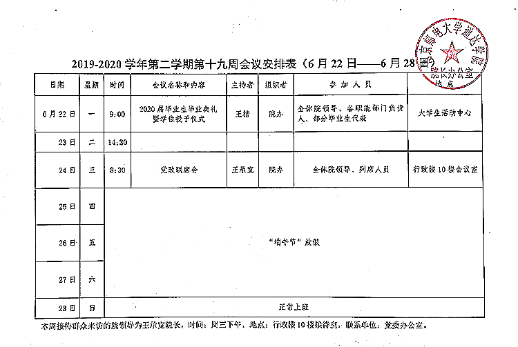 2019-2020学年第二学期第十九周会议安排表