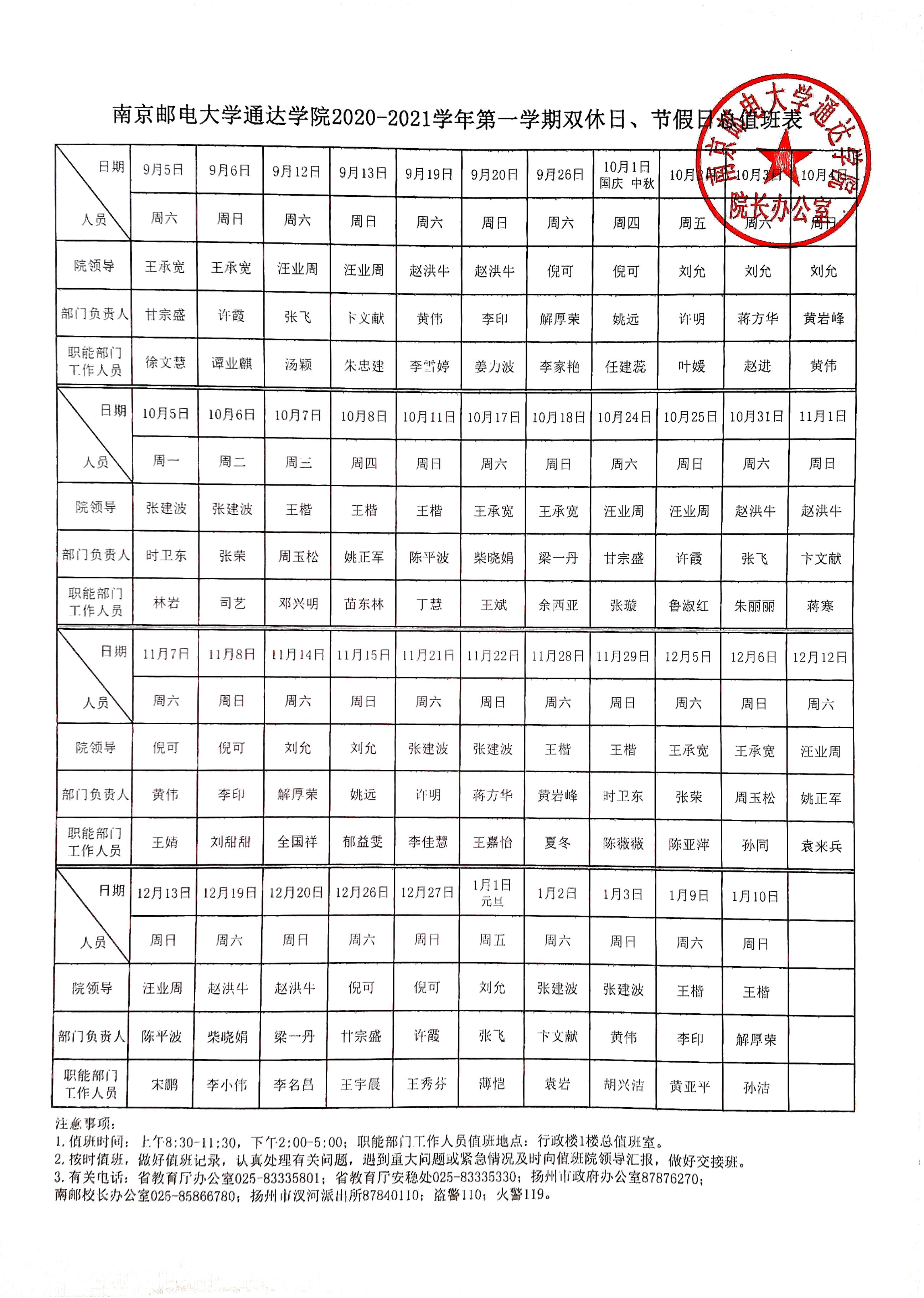 365wm完美体育网页版2020-2021学年第一学期双休日、节假日总值班表