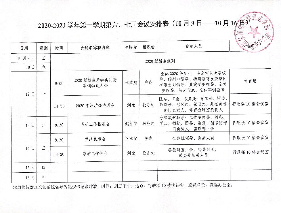 2020-2021学年第一学期第六、七周会议安排表