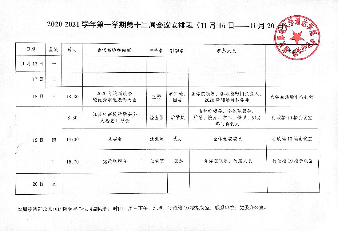 2020-2021学年第一学期第十二周会议安排表