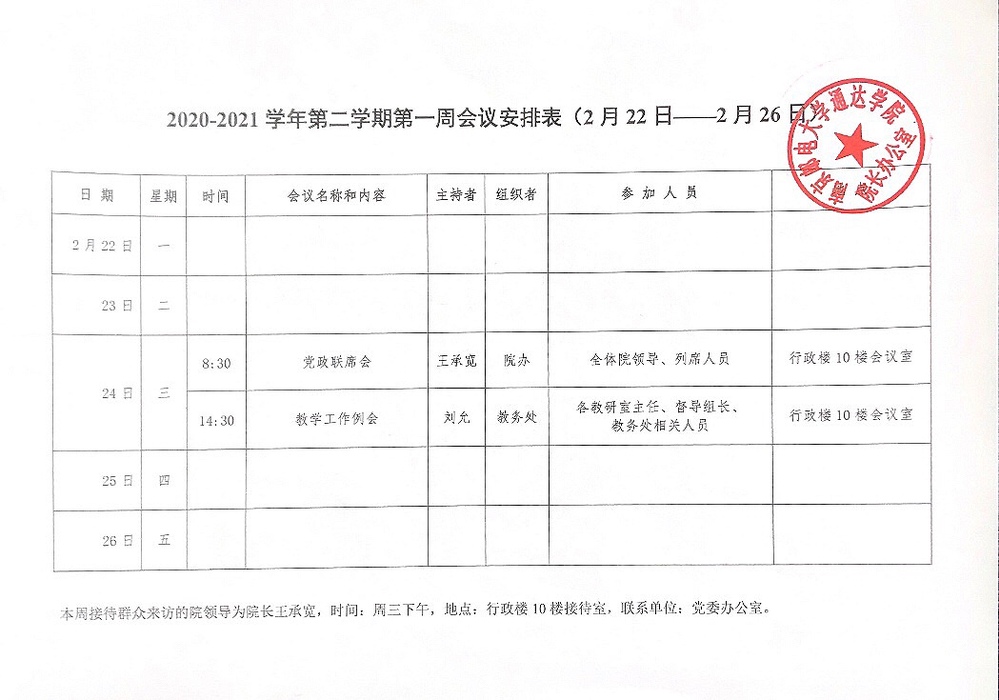 2020-2021学年第二学期第一周会议安排表