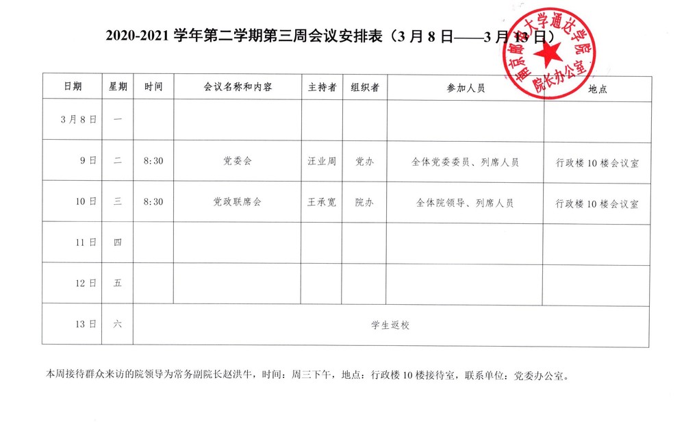 2020-2021学年第二学期第三周会议安排表