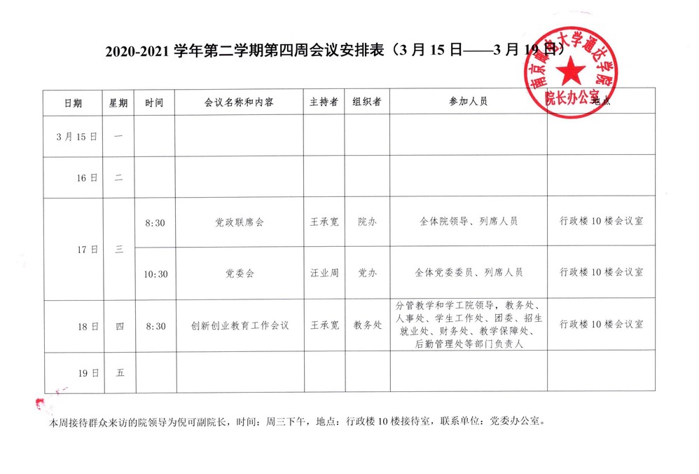 2020-2021学年第二学期第四周会议安排表