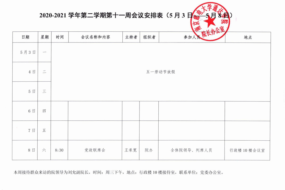 2020-2021学年第二学期第十一周会议安排表