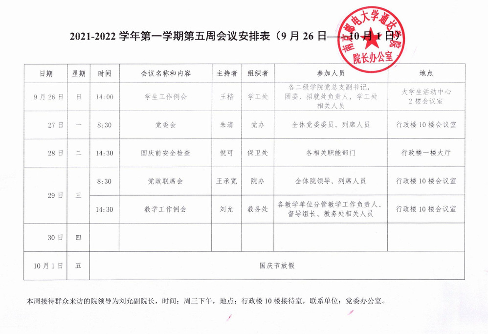 2021-2022学年第一学期第五周会议安排表