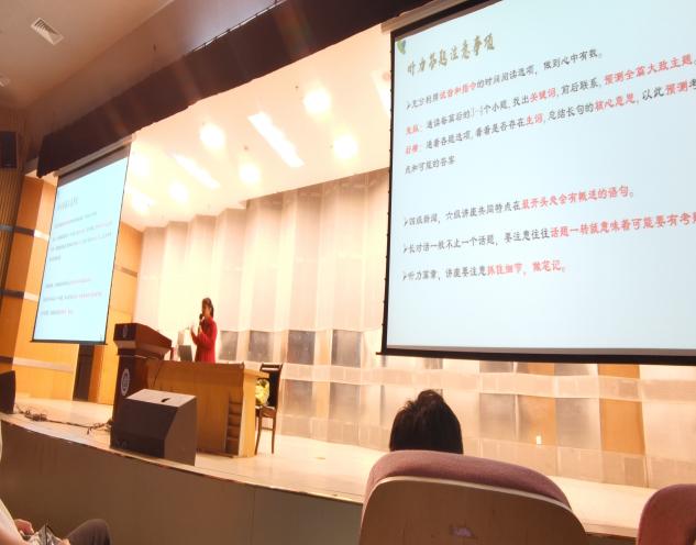 首先,苗老师介绍了英语学习的必要性和通过英语四六级考试的重要性,为同学们今后的英语学习指明了方向。接着,苗老师分别从考试流程、考试题型以及应试策略三个方面进行了详尽的解析,和同学们进一步探讨英语学习及备考复习的方法。最后,她鼓励同学们在考前冲刺阶段多做真题,不断反思总结做题技巧,预祝大家取得好的成绩。
