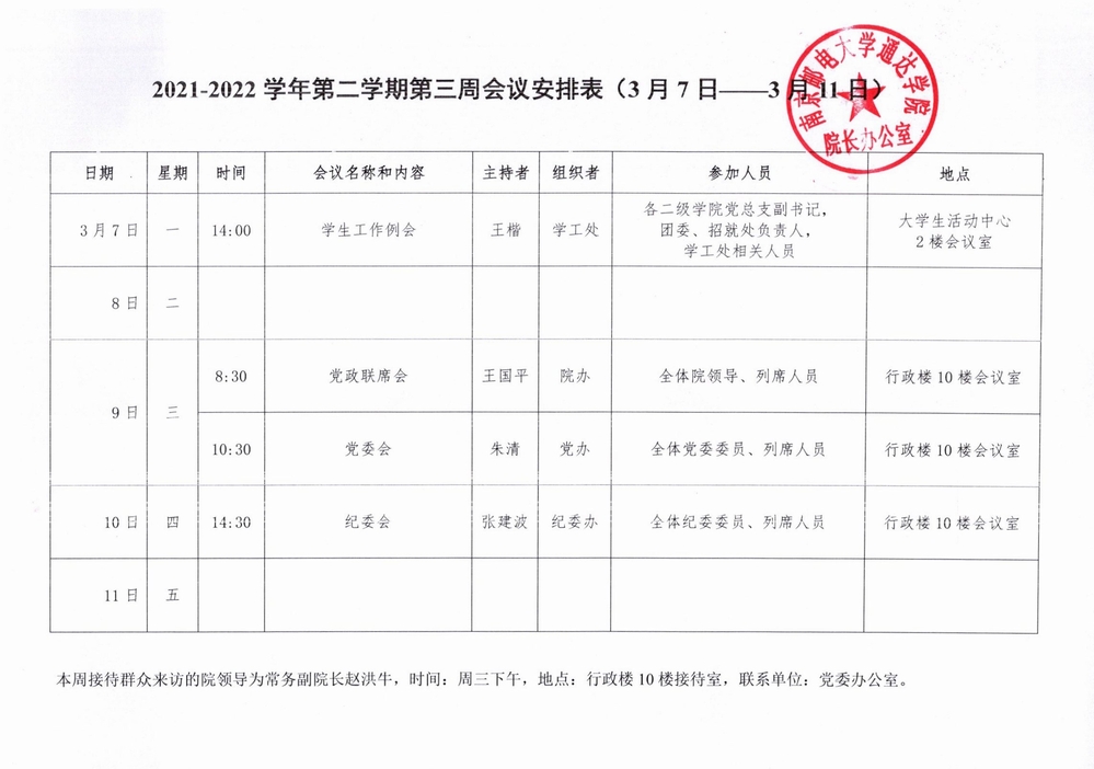 2021-2022学年第二学期第三周会议安排表