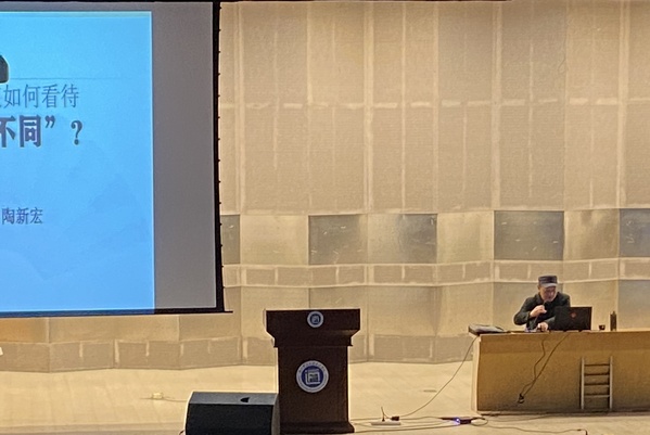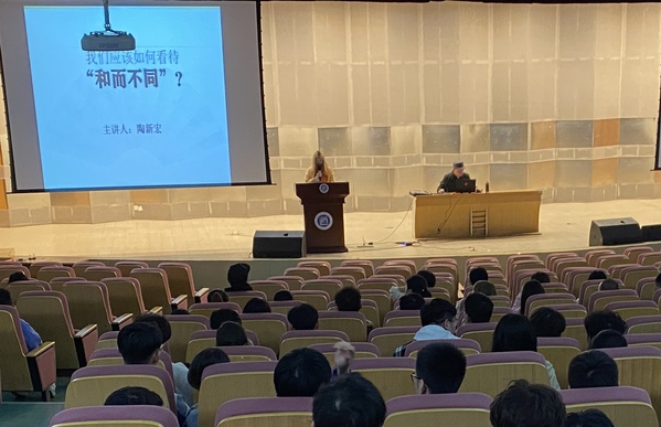 讲座伊始,陶教授指出:“文化是一个国家,一个民族的灵魂。文化兴则国运兴,文化强则民族强。”后又以习近平总书记在中国国际友好大会上的语录强调“中国‘和’文化源远流长,蕴涵着天人合一的宇宙观、协和万邦的国际观、和而不同的社会观、人心和善的道德观。”随后,他围绕“和而不同”的哲学渊源及其内涵开展讲解,深度剖析“和”文化的生成脉络。最后,陶教授为同学们解读了“和而不同”丰富的现代价值,并强调其不仅是为人处事的原则,也是处理国家之间、民族之间、文化之间、宗教之间关系的准则,希望同学们能够做到“胸怀天下,善待他人”。陶教授的讲座在热烈的掌声中结束。