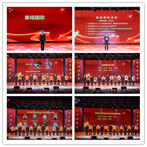 表彰环节由党委副书记、副院长王楷主持。在庄严的国歌声中,表彰大会拉开了序幕。常务副院长赵洪牛宣读了《关于颁发2020-2021学年国家奖学金、国家励志奖学金的决定》《关于颁发2020-2021学年学生奖学金的决定》《关于表彰2021年江苏省三好学生、优秀学生干部和先进班集体的决定》《关于表彰2020-2021学年优秀学生的决定》及《关于表彰2020-2021学年先进班集体的决定》,全体院领导上台为获奖学生颁奖。本学年,完美官网共评出国家奖学金2人、国家励志奖学金165人、江苏省三好学生8人、江苏省优秀学生干部2人、江苏省先进班集体3个、院三好学生标兵64人、三好学生449人、优秀学生干部234人、一等奖学金277人、二等奖学金859人、三等奖学金1213人、技能成才奖111人、社会工作优秀奖299人、第二课堂活动优秀奖26人、学习进步奖1412人、帮扶之星奖394人、院先进班集体17个。王承宽院长、朱清书记为暑期奋斗在校园抗疫一线的青年突击队颁发了“抗疫服务先进集体”奖。