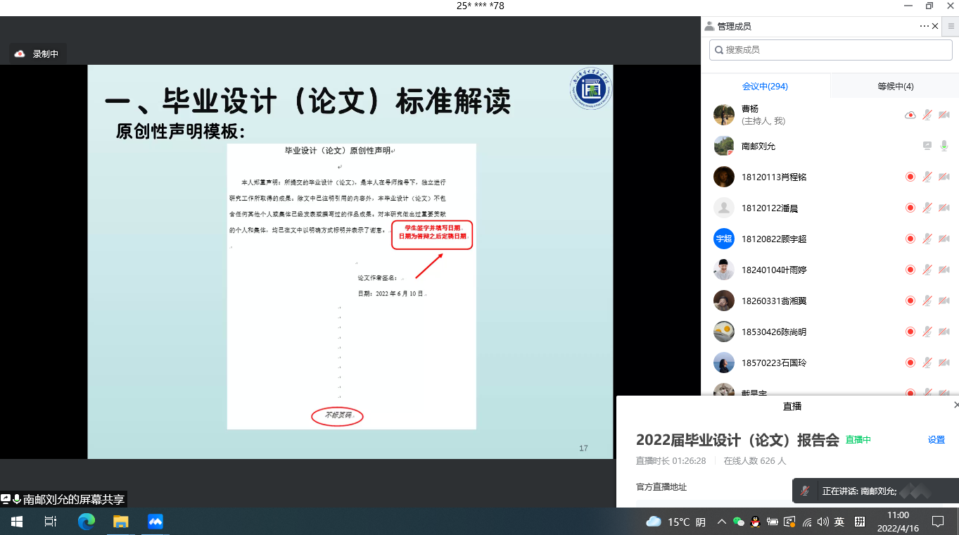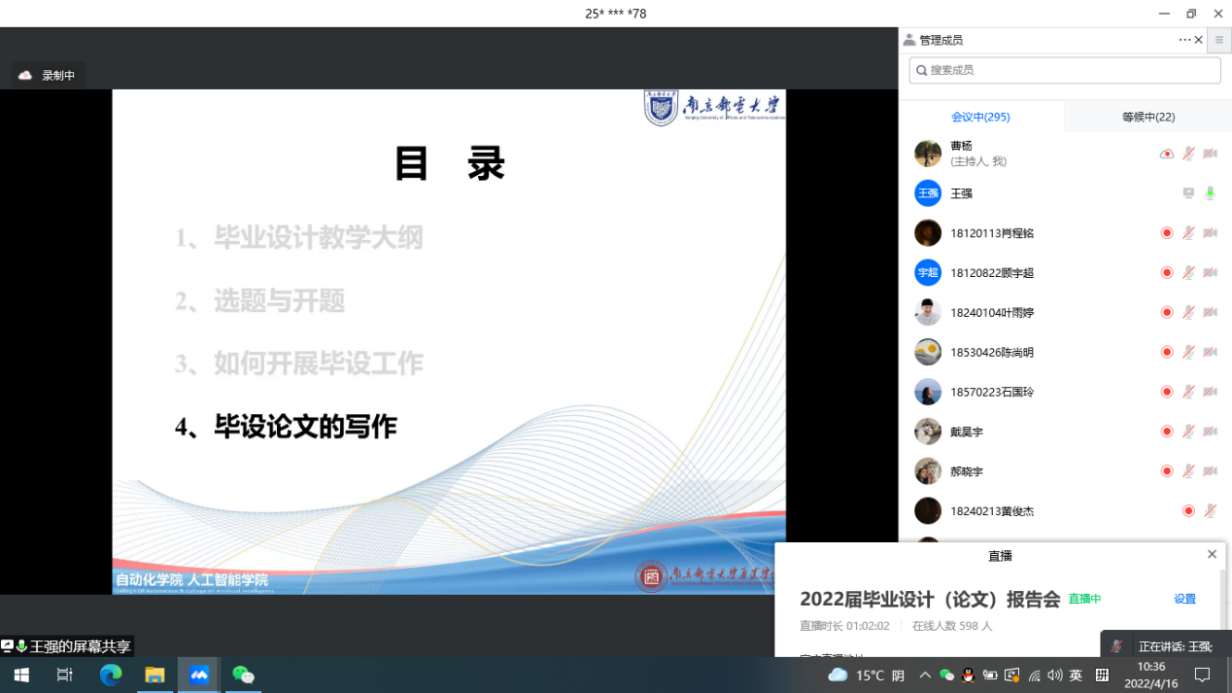 4月16日上午,完美官网线上召开2022届毕业设计(论文)报告会。会议邀请了365wm完美体育网页版自动化学院王强副院长和365wm完美体育网页版刘允副院长作报告,各二级学院教学院长、教学秘书、全体2022届毕业生及教务处相关人员参加会议。