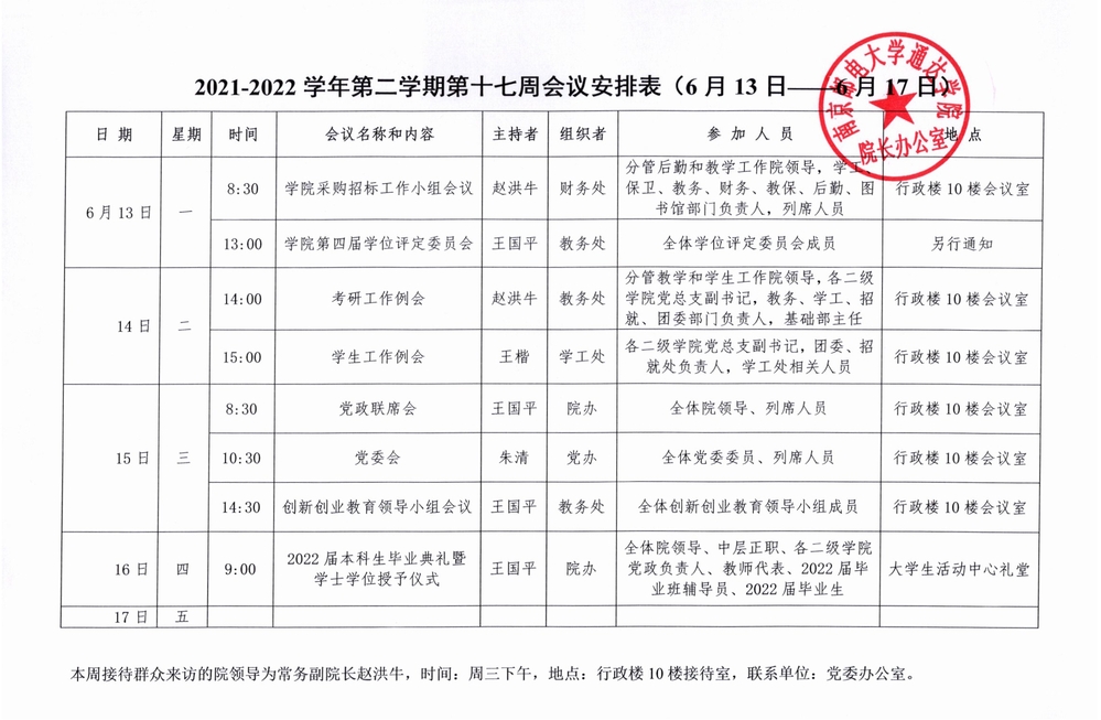 2021-2022学年第二学期第十七周会议安排表