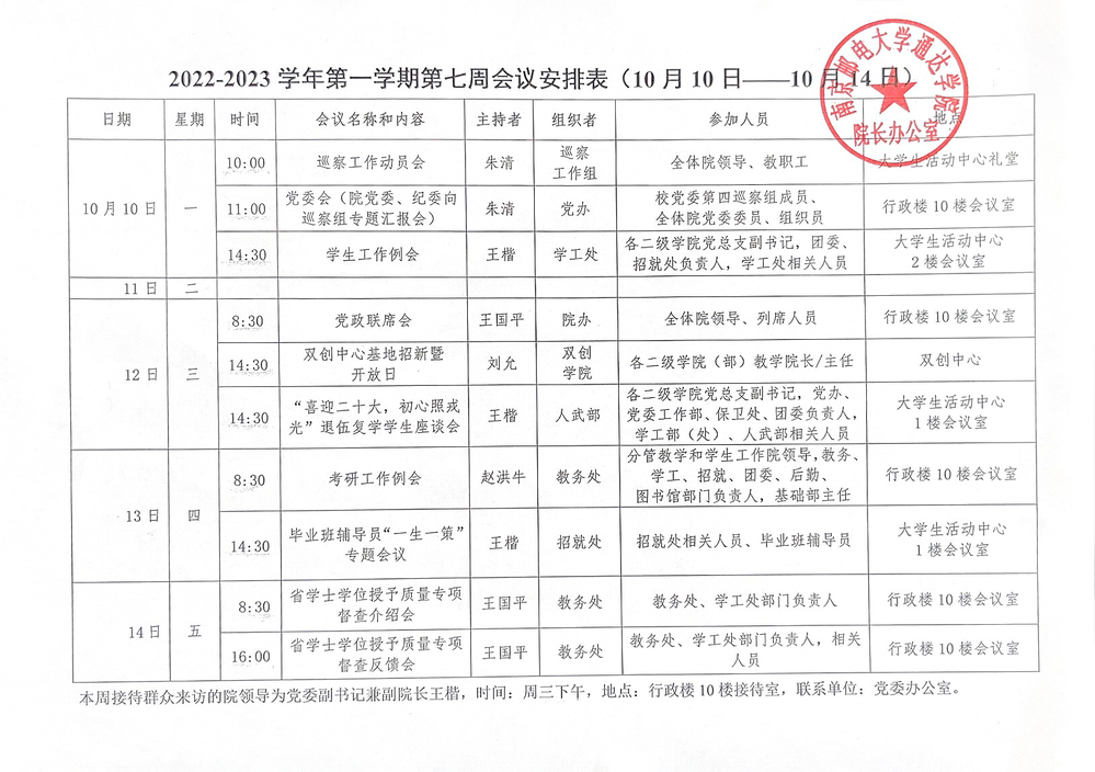 2022-2023学年第一学期第七周会议安排表