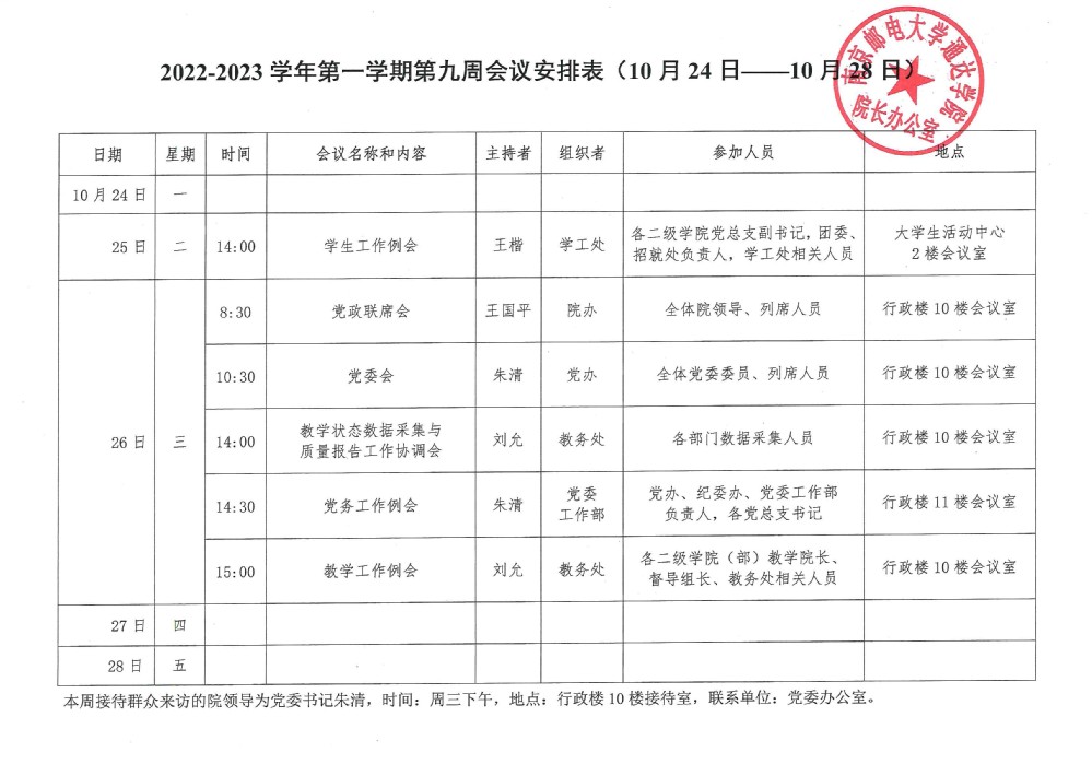 2022-2023学年第一学期第九周会议安排表