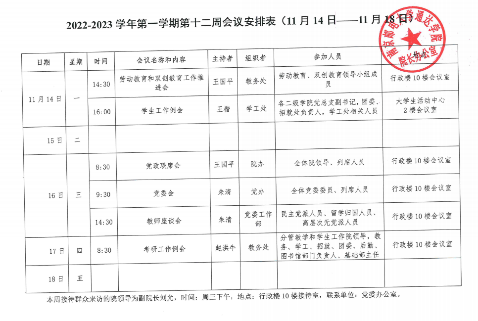 2022-2023学年第一学期第十二周会议安排表
