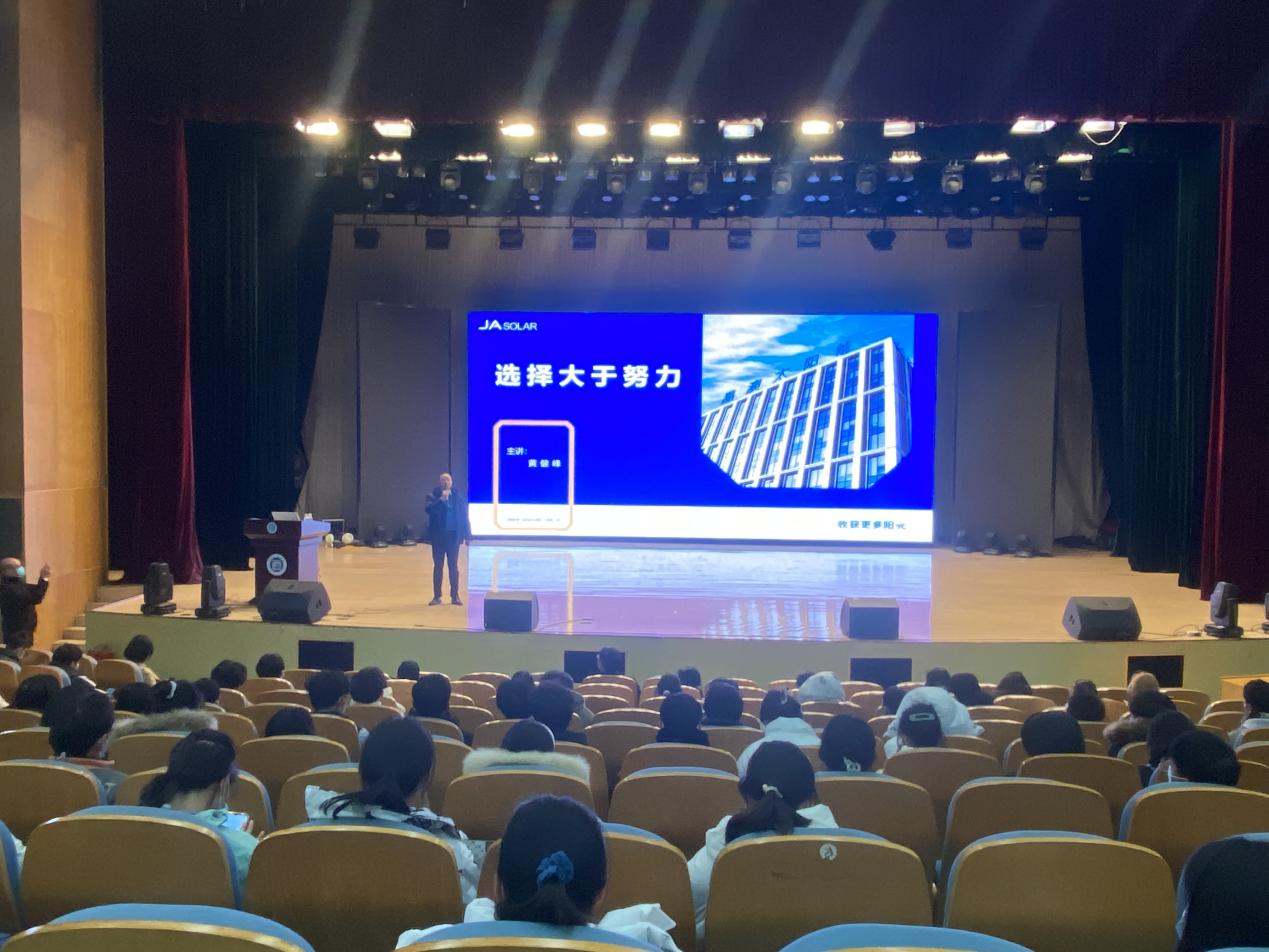 讲座现场,黄总通过与学生的互动问答活跃了现场气氛,他从光伏行业发展背景、晶澳科技介绍与优势、晶澳人才发展理念及规则三个方面详细为大家进行了阐述,在向同学们传递了晶澳“开发太阳能、造福全人类”的发展理念的同时,表明选择晶澳科技的正确性,从而诠释了“选择大于努力”的主题。黄总最后祝愿同学们未来都能做出正确选择,收获美好未来。