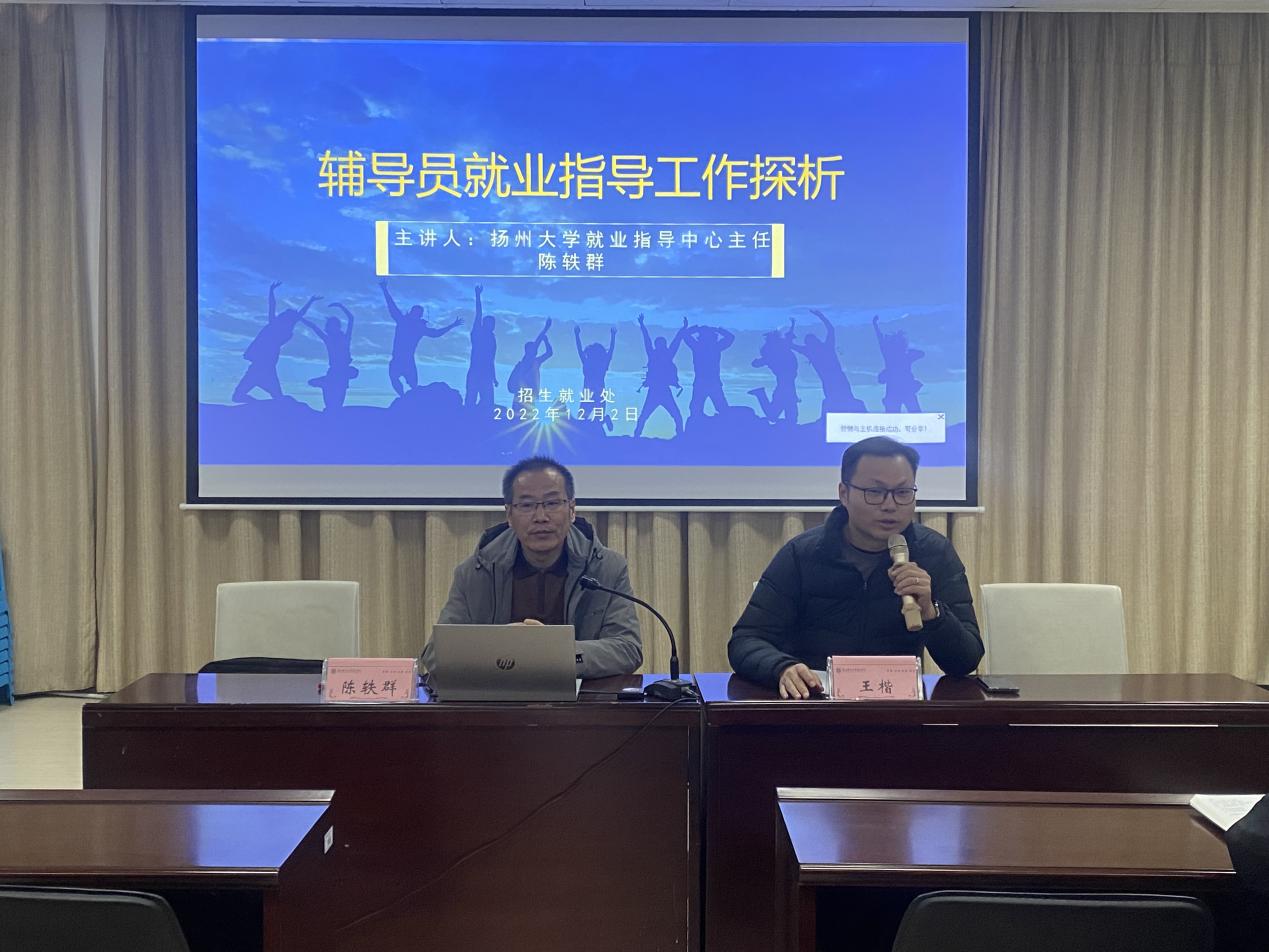 12月2日下午,完美官网邀请扬州大学就业指导中心主任陈轶群给全体辅导员就“辅导员就业指导工作探析”作专题培训。培训活动在大学生活动中心招生就业指导大厅进行,招就处处长解厚荣、各二级学院党总支副书记、全体专职辅导员及招就处相关人员参加。活动由学院党委副书记王楷主持。
