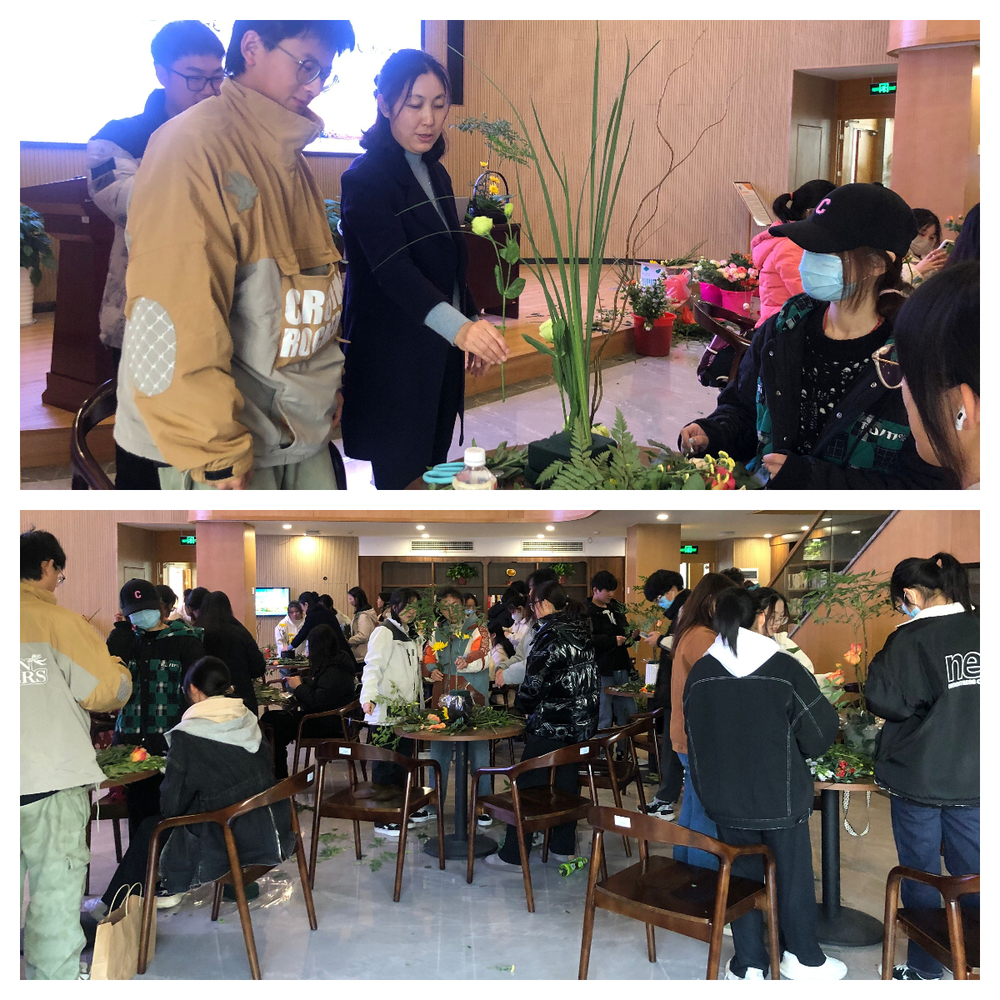 “插花的第一步是修剪,去掉花上的残叶,先插花后插叶,注意层次、色彩、主次关系……”,在居教授的示范和指导下,同学们纷纷化身“巧手设计师”,灵活运用所学到的理论知识,凭借个人对“美”的不同理解,一边交流探讨,一边修枝剪叶、搭配色彩、设计造型,享受着亲手创作的乐趣。一盆盆错落有致、创意十足的插花作品随即展现在大家眼前,令人赏心悦目。