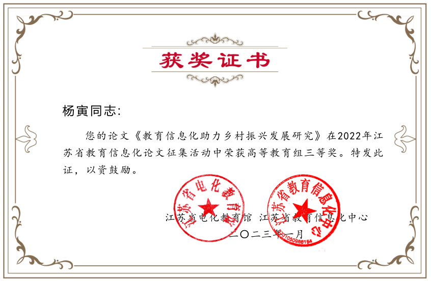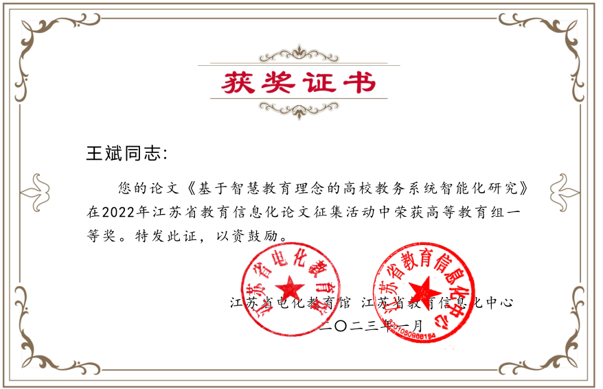 近日,江苏省教育厅电化教育馆公布了2022年江苏省教育信息化论文征集比赛获奖名单。完美官网王斌老师的论文《基于智慧教育历年的高校教务系统智能化研究》,唐军老师的论文《江苏高等教育智慧教育平台建设与实践研究》,王珺婕、蔡政、黄欣雅同学的论文《教育信息化助力乡村振兴发展研究》(指导老师:杨寅)荣获一、二、三等奖各一项。