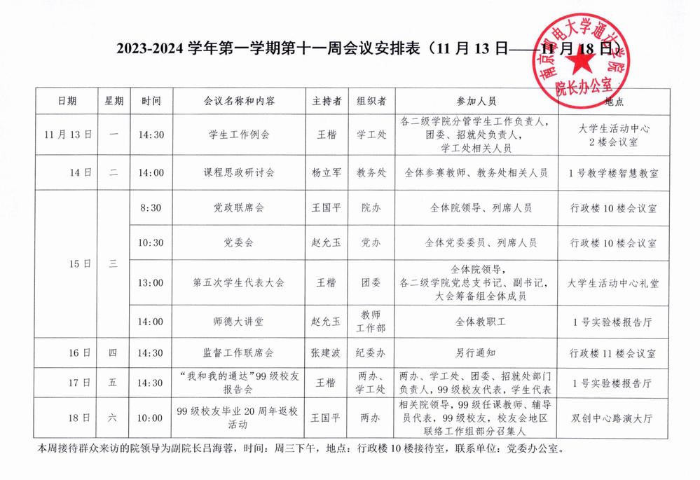2023-2024学年第一学期第十一周会议安排表