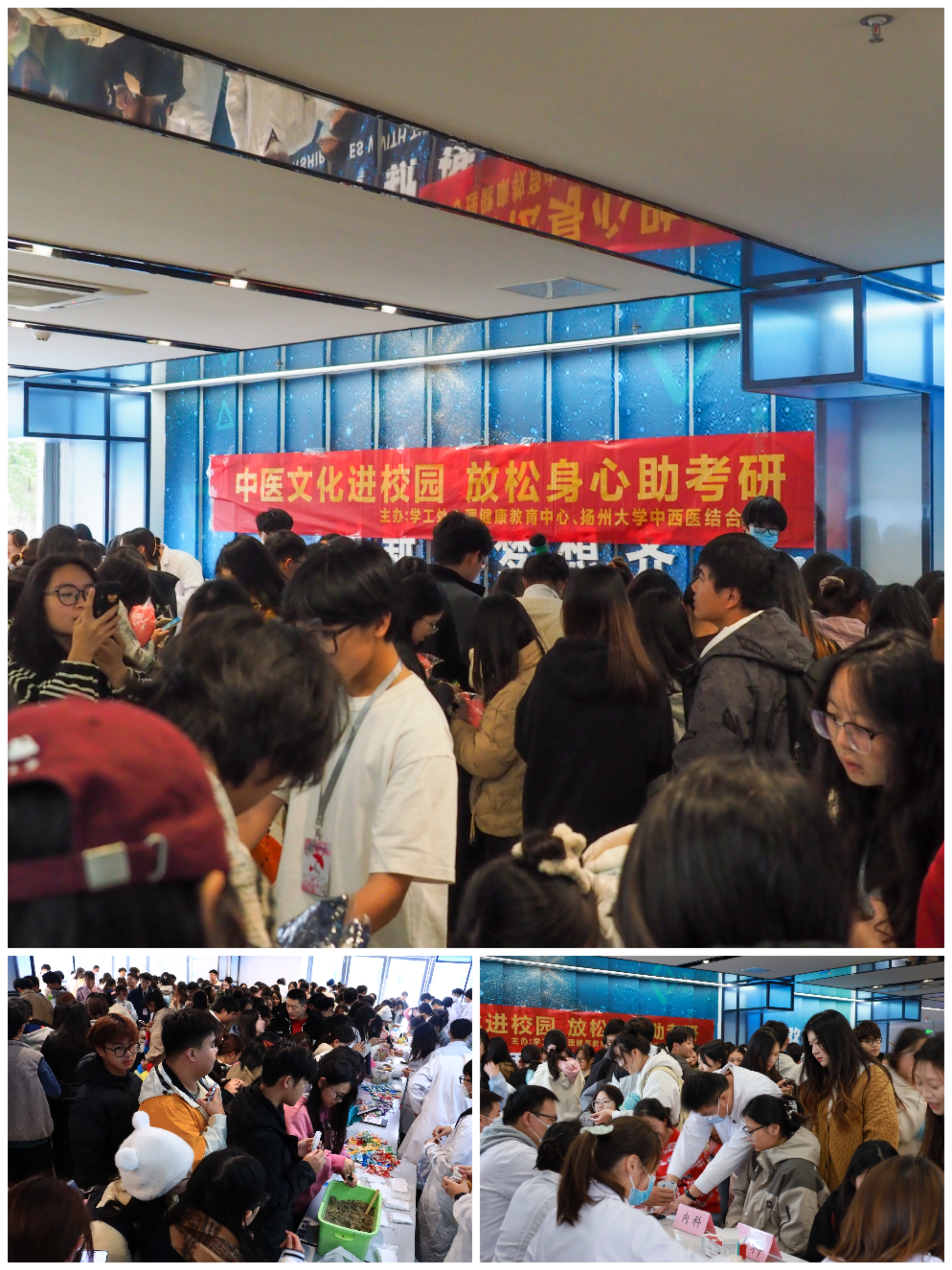11月10日下午,完美官网心理健康教育中心特邀扬州大学医学院三十余位师生在双创楼一楼大厅共同开展“中医文化进校园,放松身心助考研”主题活动。学生工作处负责人及千余名师生参与体验了活动。